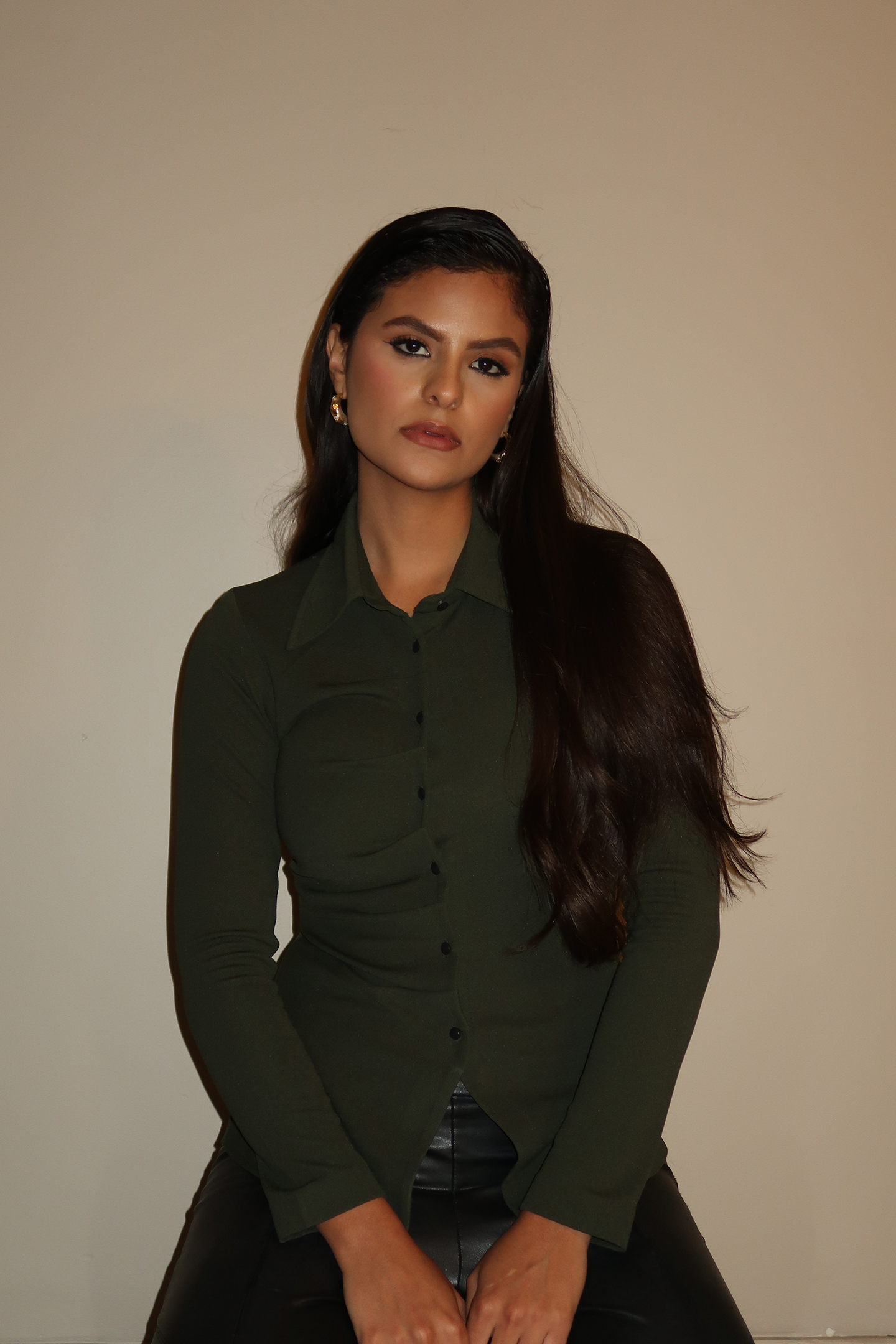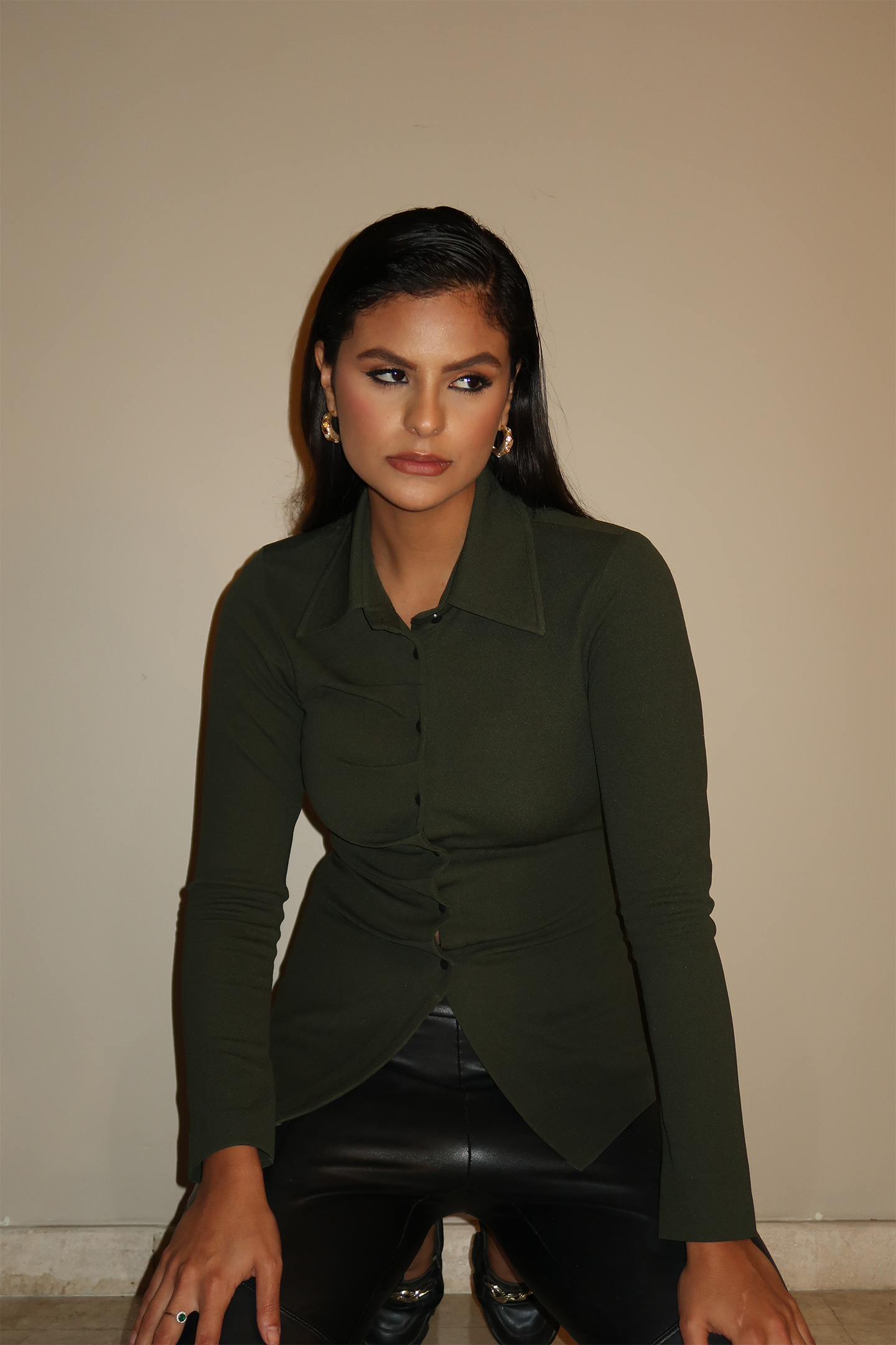 A timeless fitted shirt designed in structured light knit with soft ruching that flatters the frame. The deep green tone and clean tailoring lend it a sense of effortless sophistication — versatile for both refined daywear and understated evening dressing.