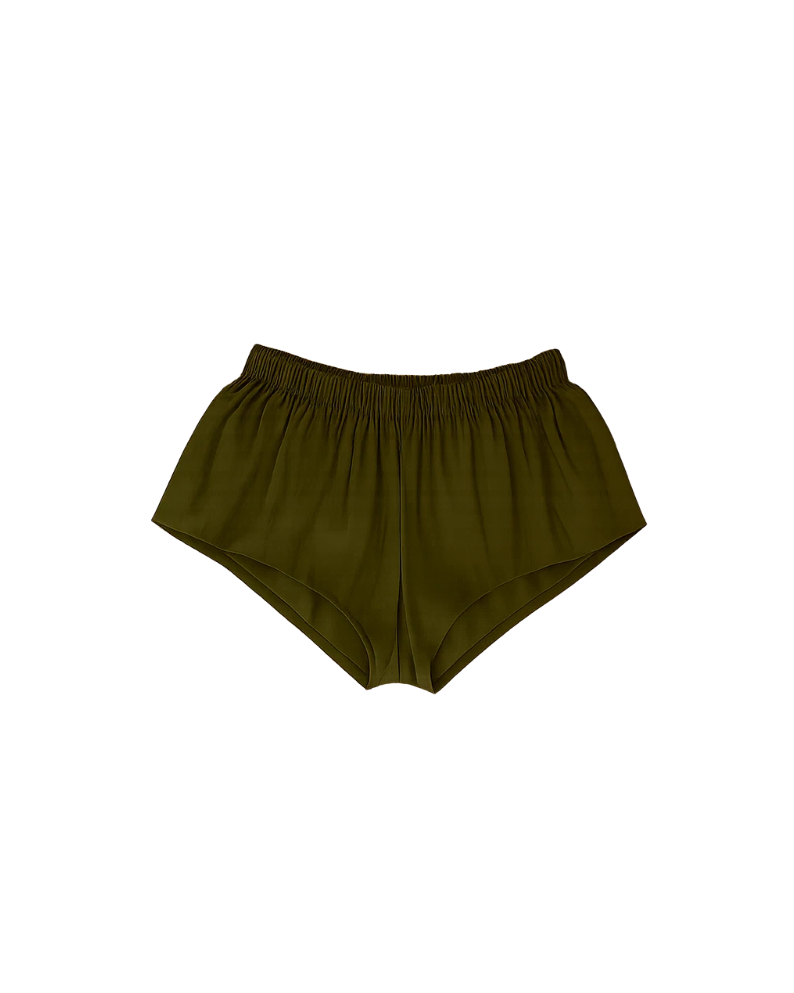 The Mini Shorts: Cut from the same butter silk, these high-waisted ruched mini shorts contour the body with a flattering fit. Their gathered detailing adds depth and texture, making them as statement-making as they are versatile.