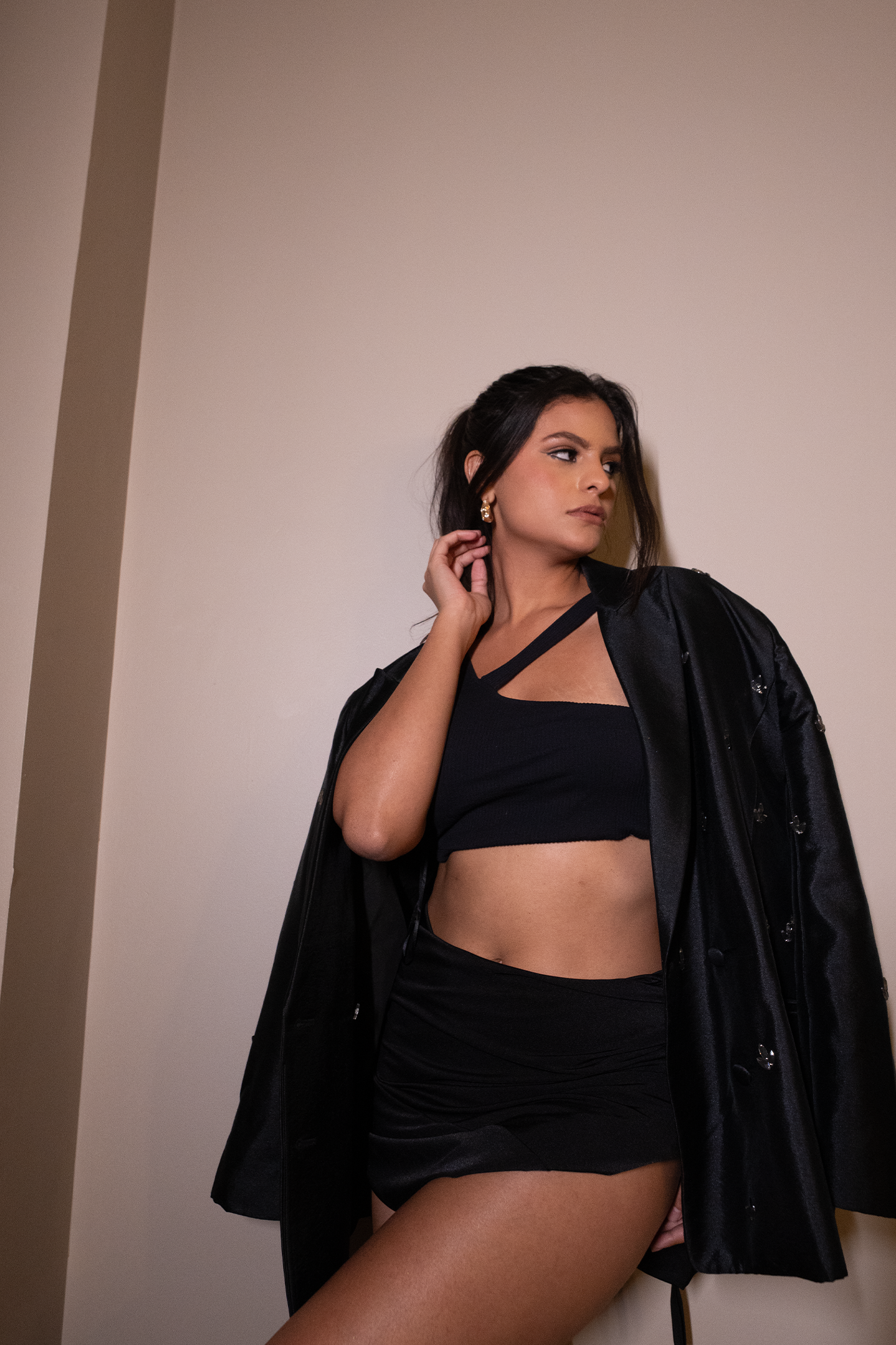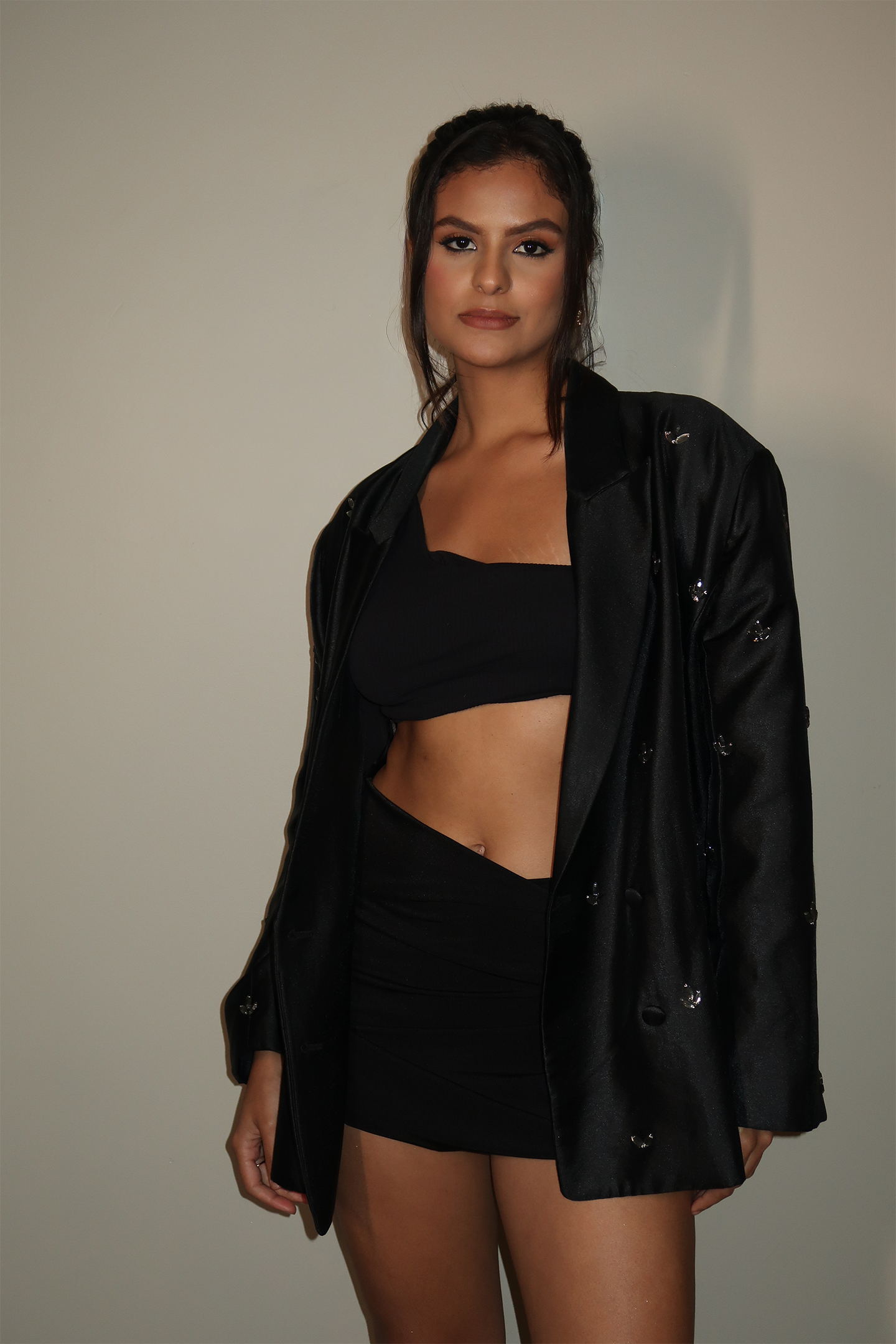 An all-black statement ensemble that merges structure with sensuality — featuring an oversized embellished satin blazer layered over an asymmetric bralette and ruched mini skirt. Designed for bold evenings and elevated nights out, this set captures modern glamour with ease.