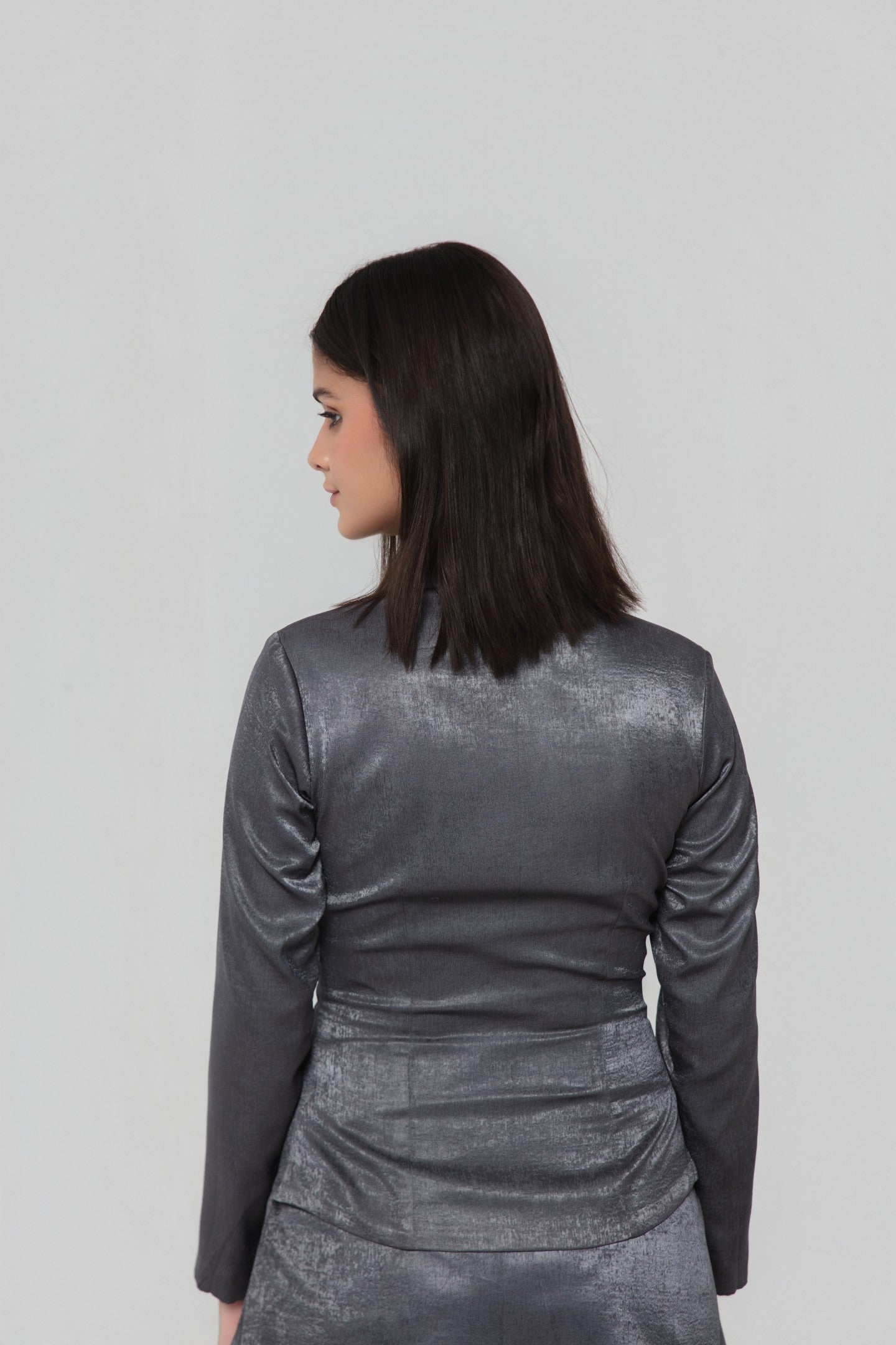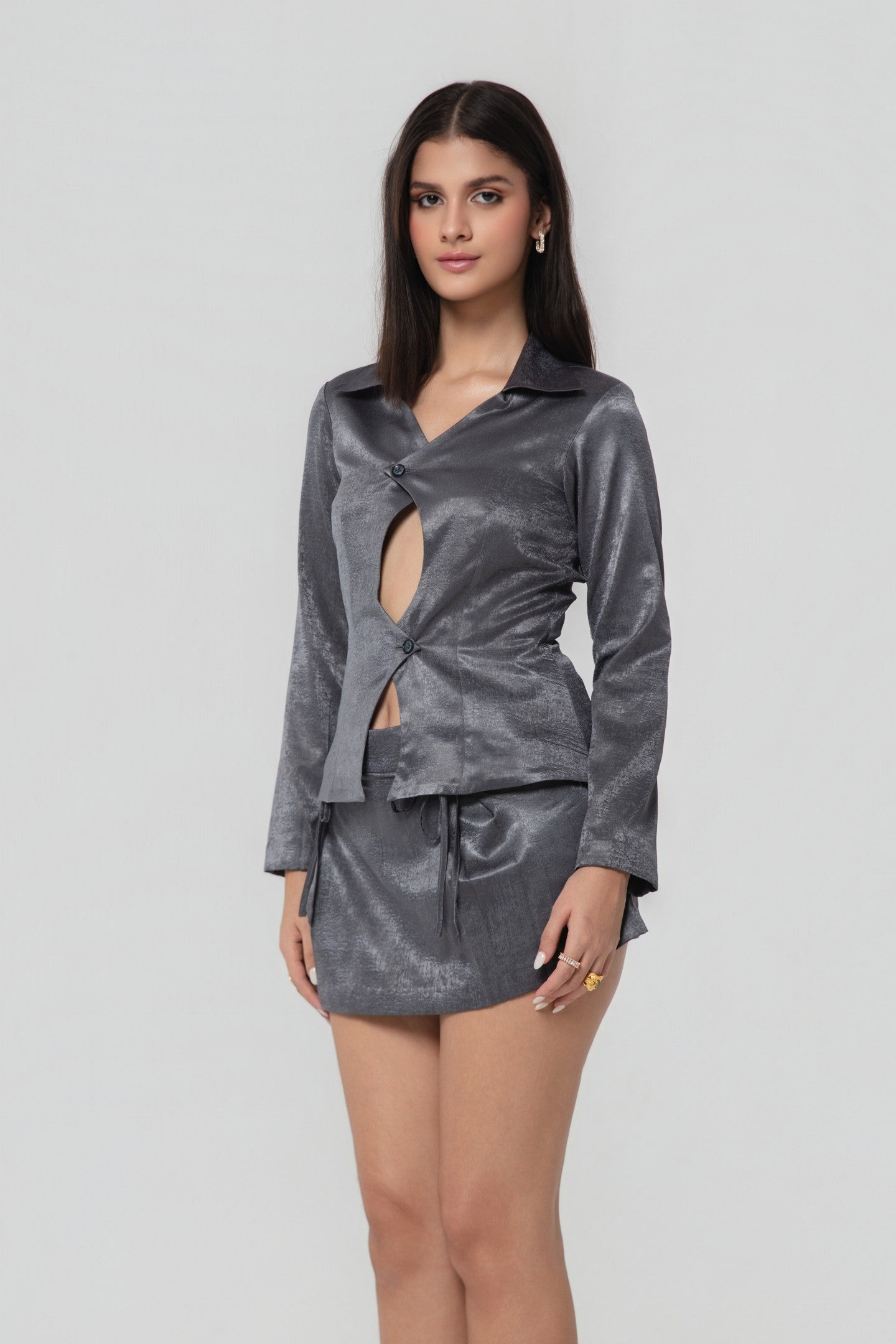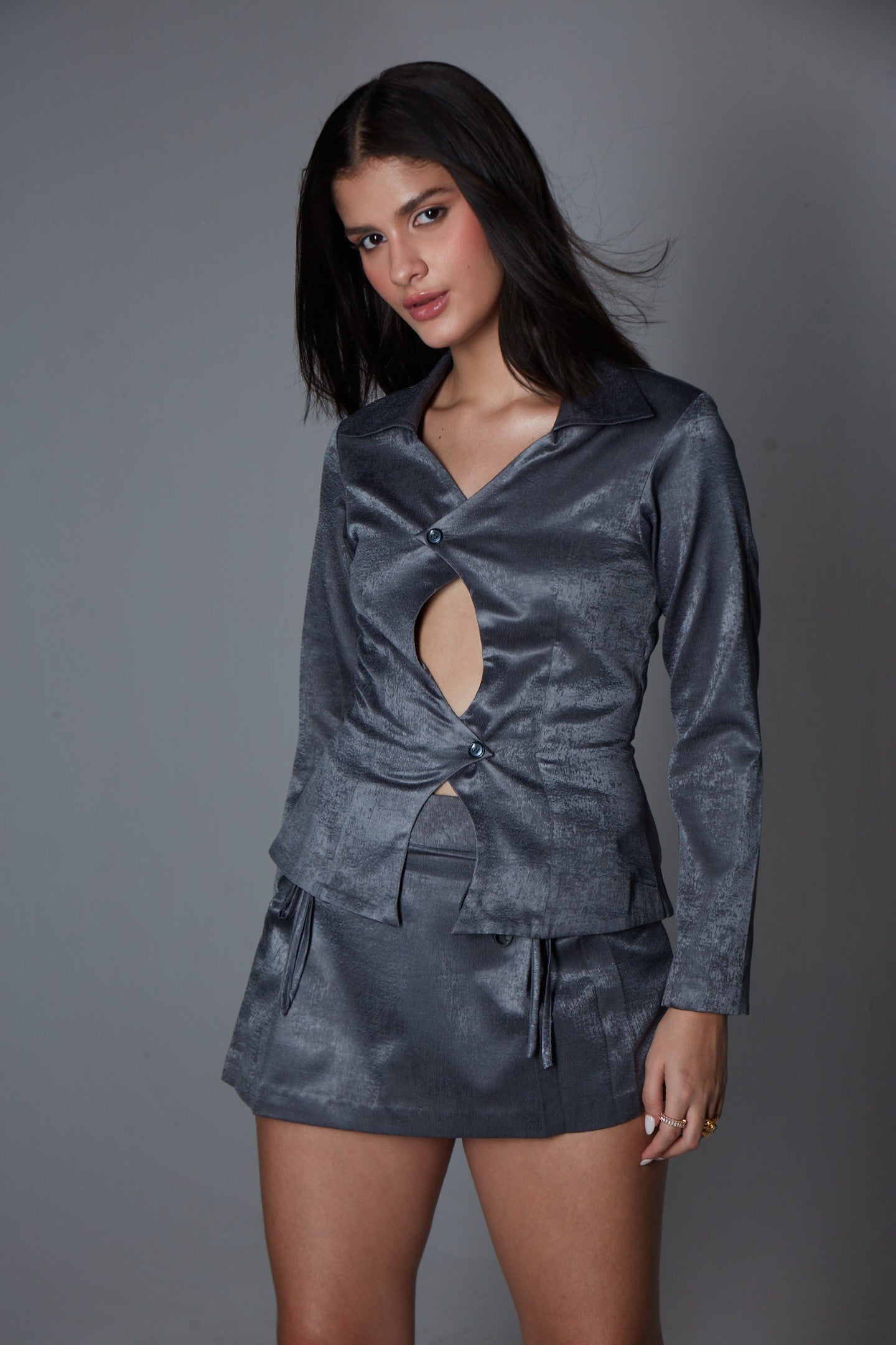 A bold, sculpted top with a unique cut-out front and asymmetric button closure, designed to contour the waist and make a sleek statement.