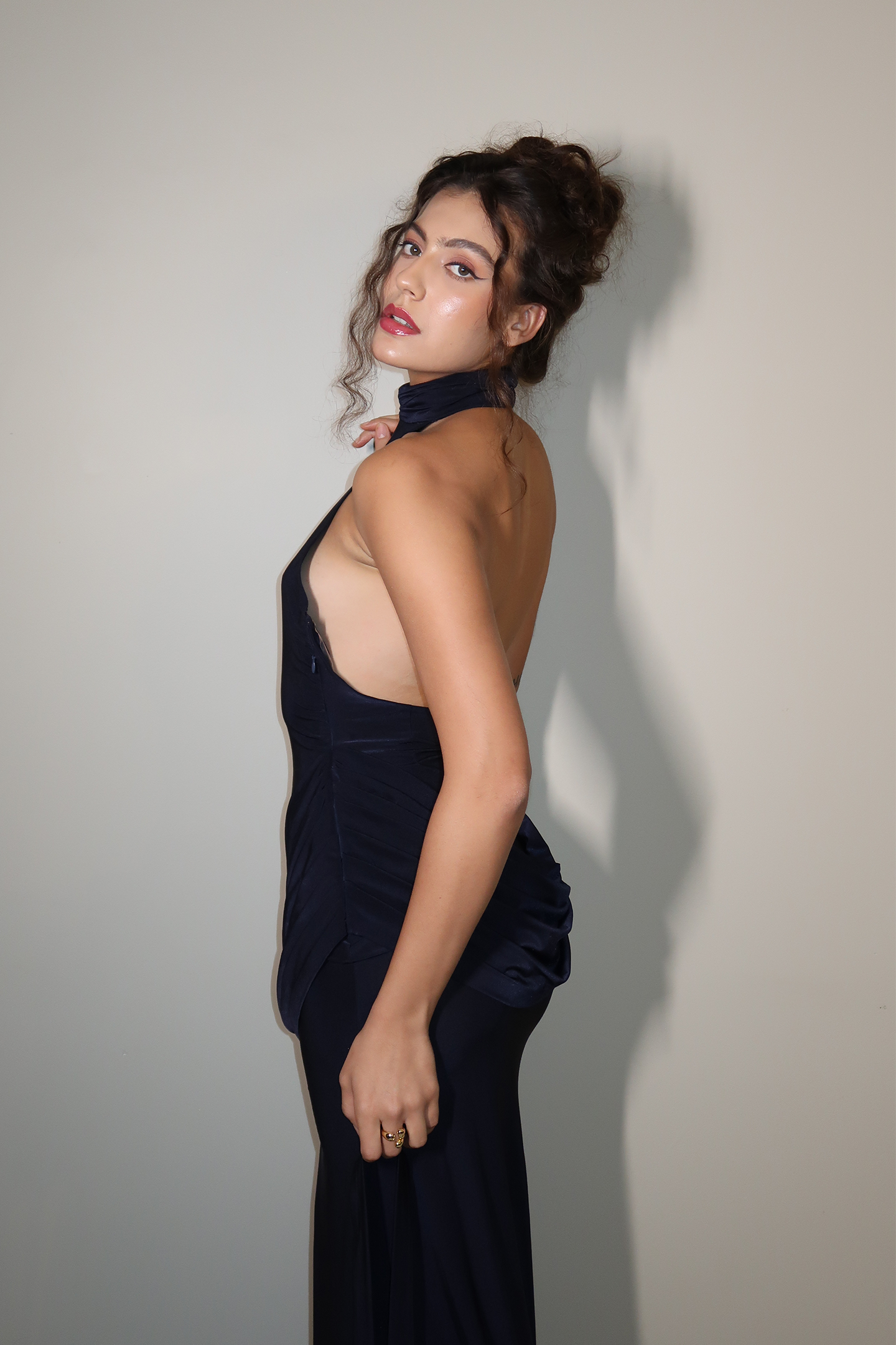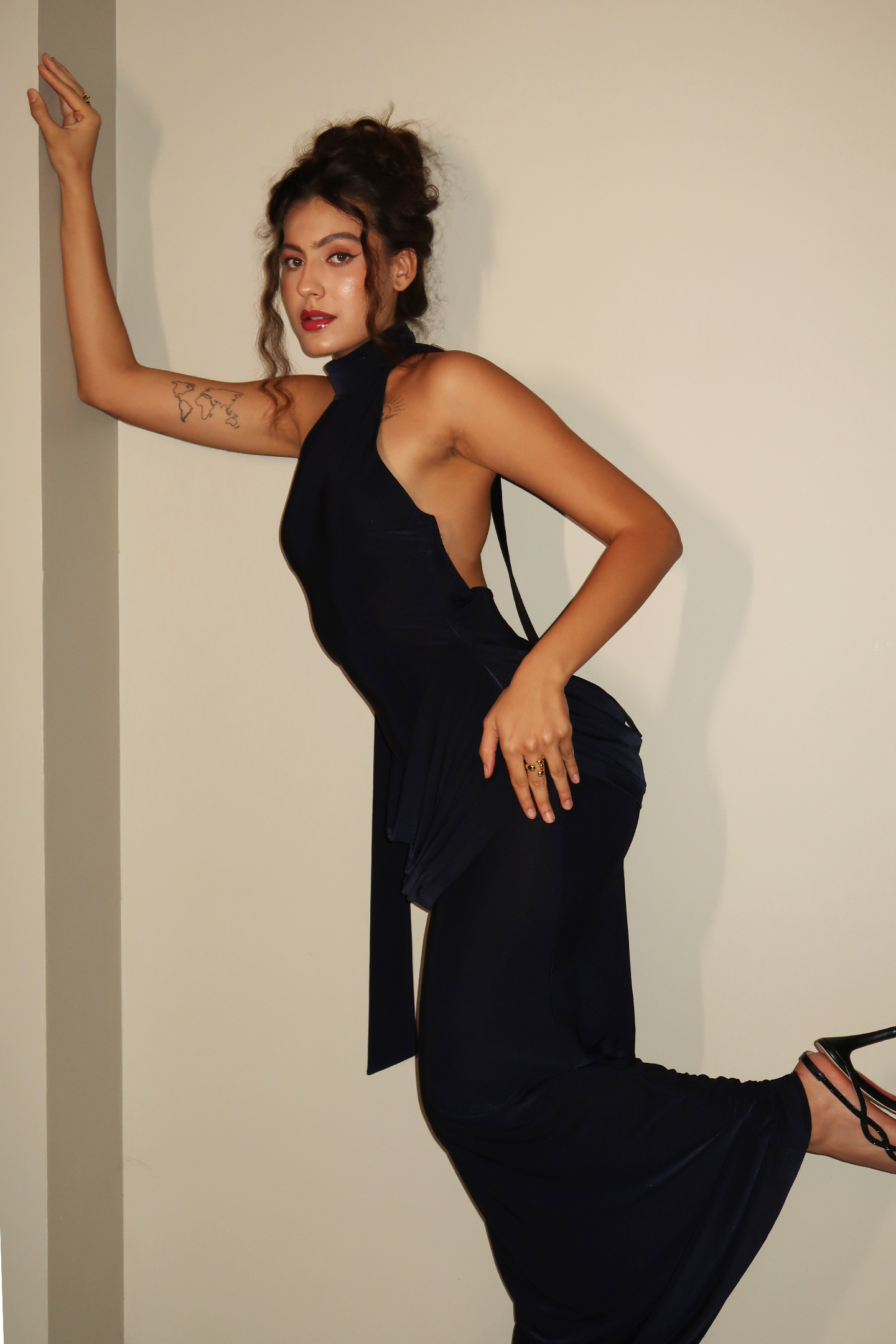 A striking halter gown that redefines modern eveningwear with its asymmetric draping and open-back silhouette. Crafted from lustrous lycra that hugs and flows with ease, it exudes a quiet confidence — perfect for intimate soirées or statement occasions.