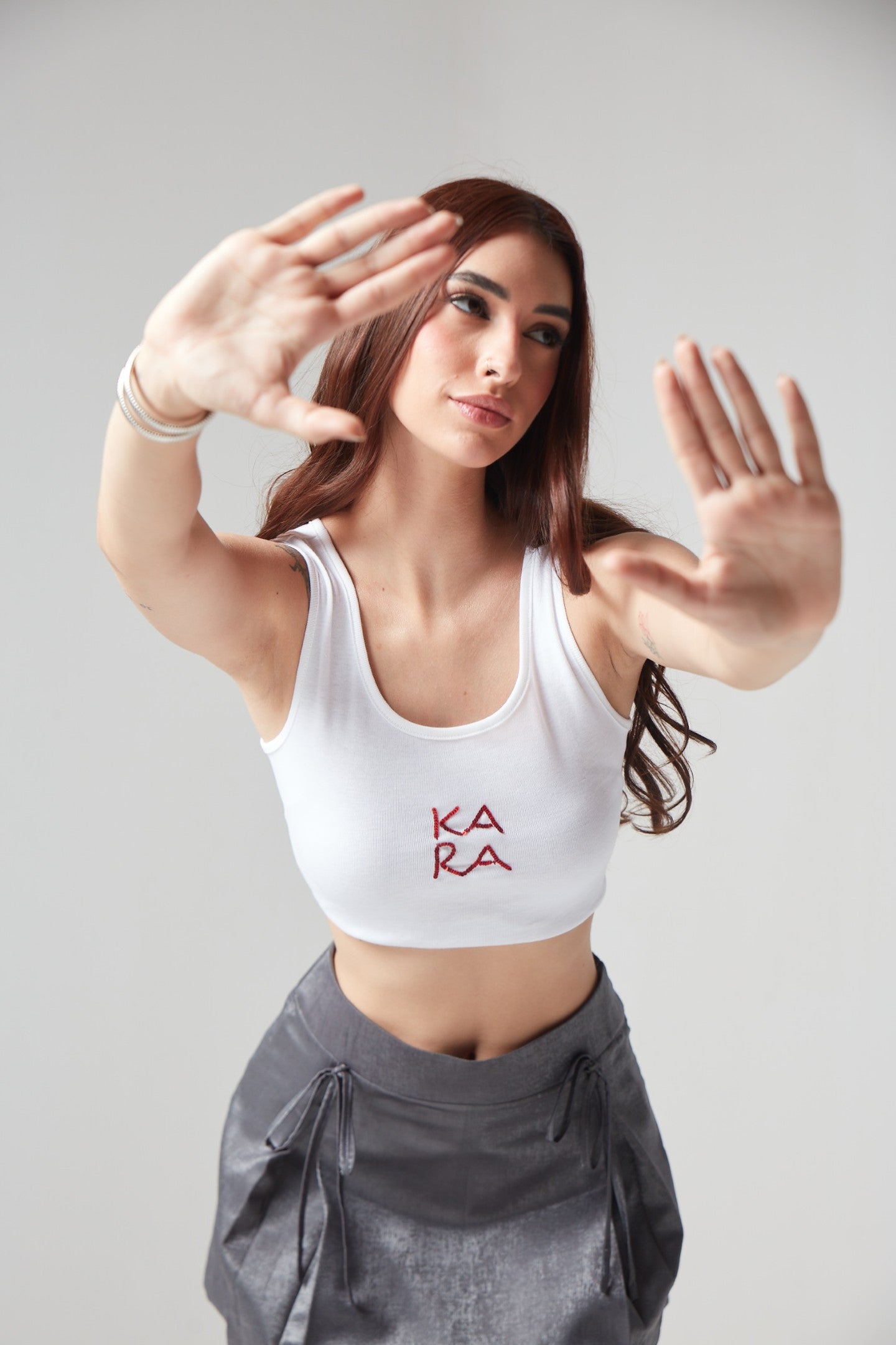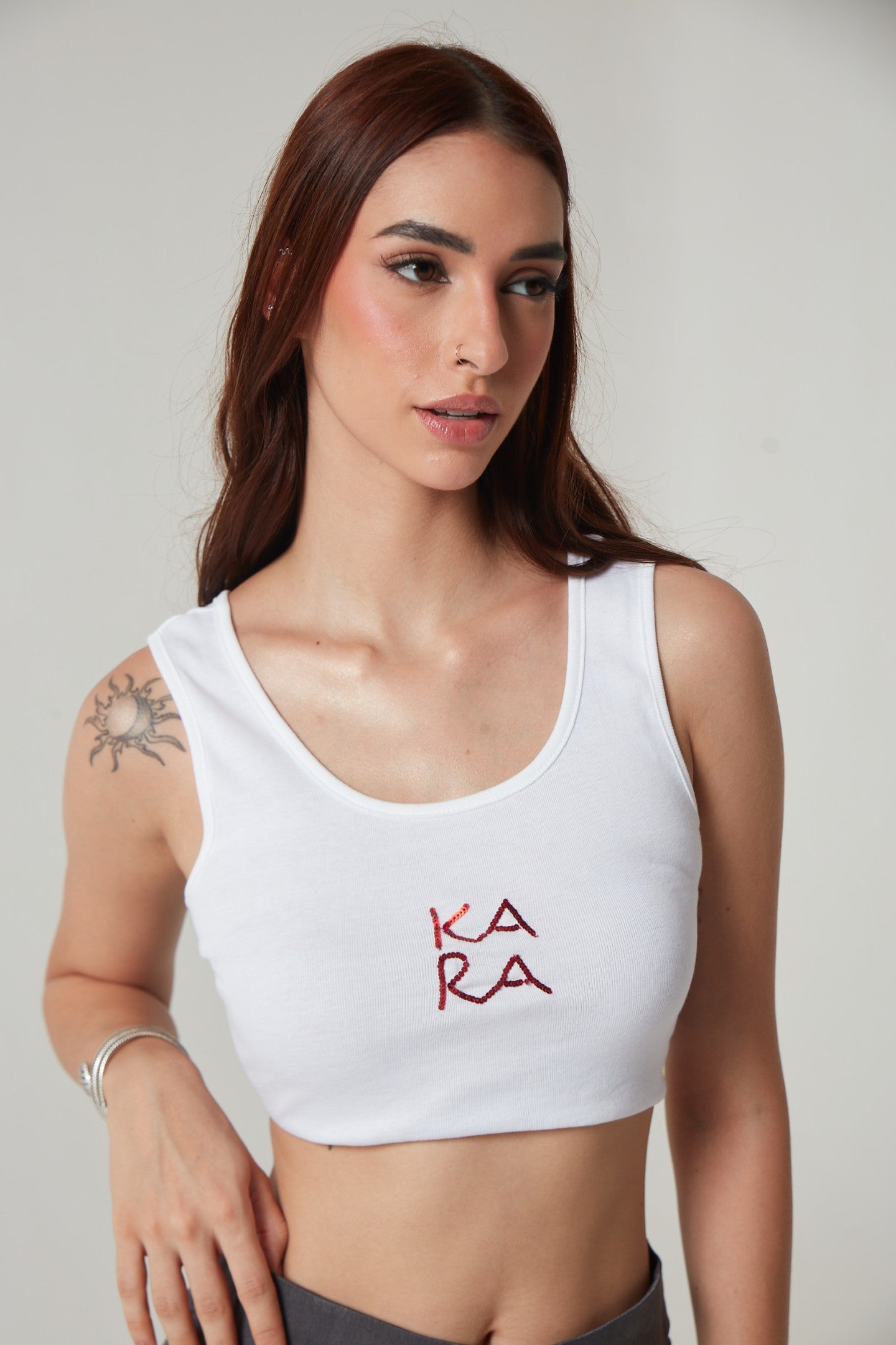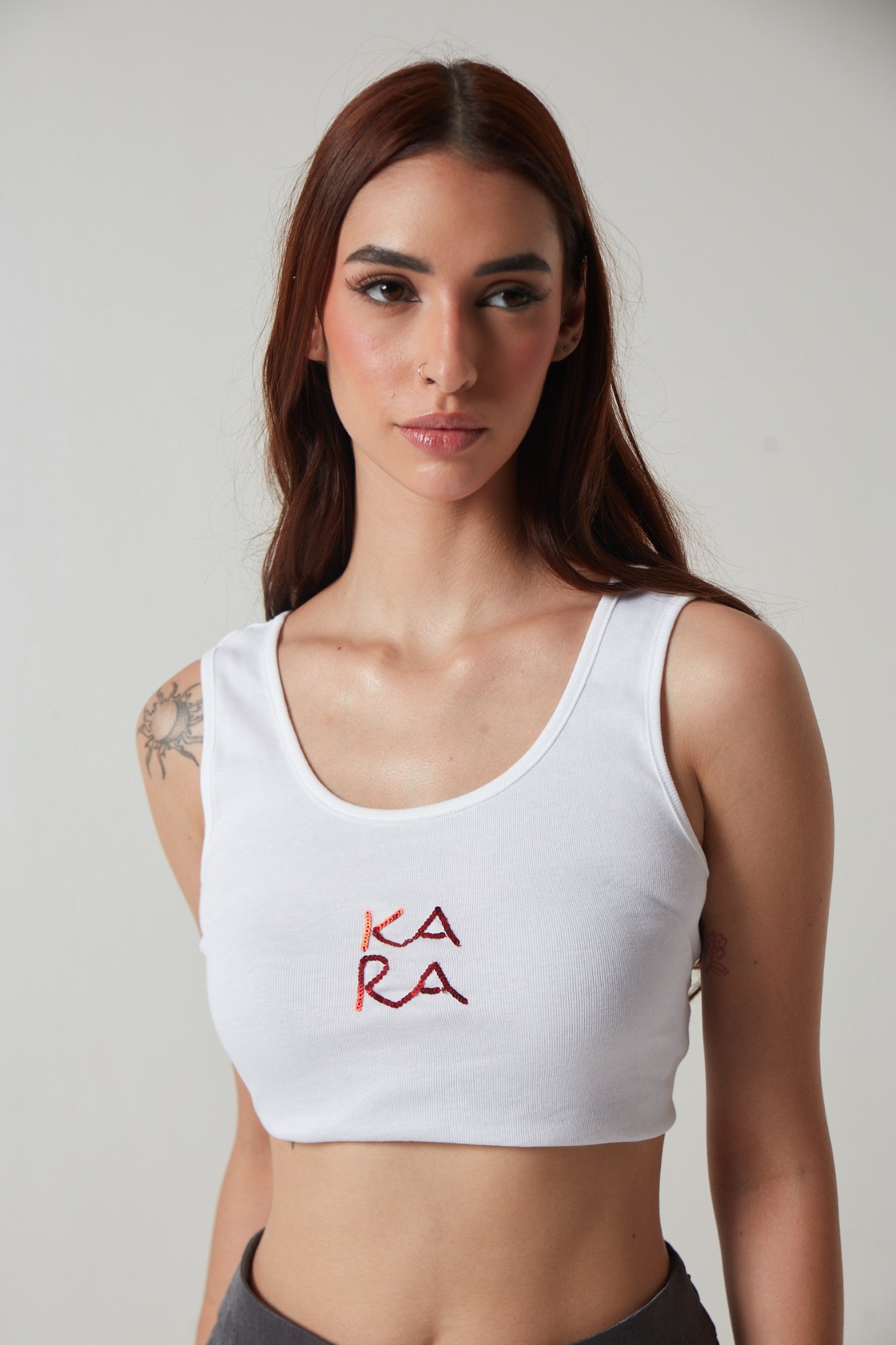 A classic tank designed for effortless off-duty styling, featuring the signature KARA embroidered logo for a minimal yet statement touch. The tank has been folded as a cropped tank for styling purposes.