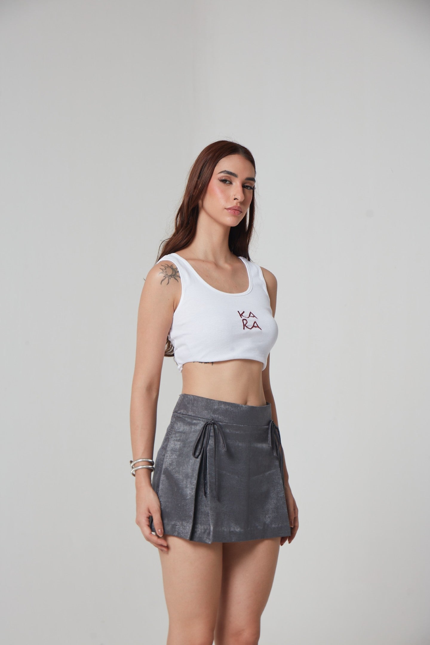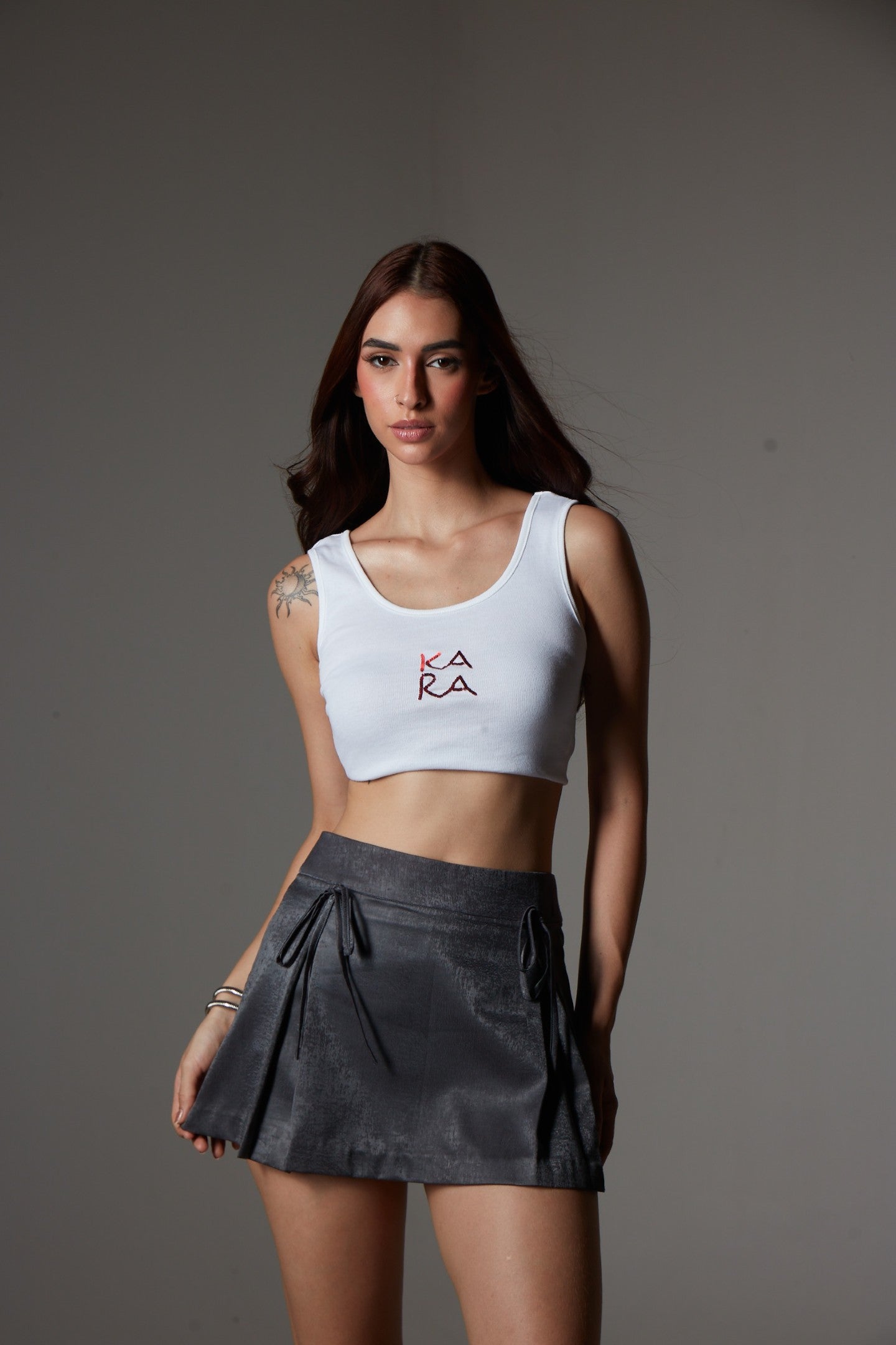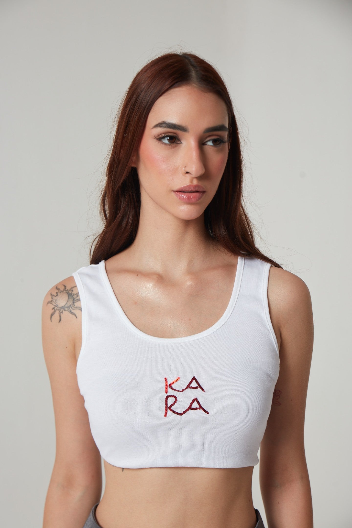 A classic tank designed for effortless off-duty styling, featuring the signature KARA embroidered logo for a minimal yet statement touch. The tank has been folded as a cropped tank for styling purposes.