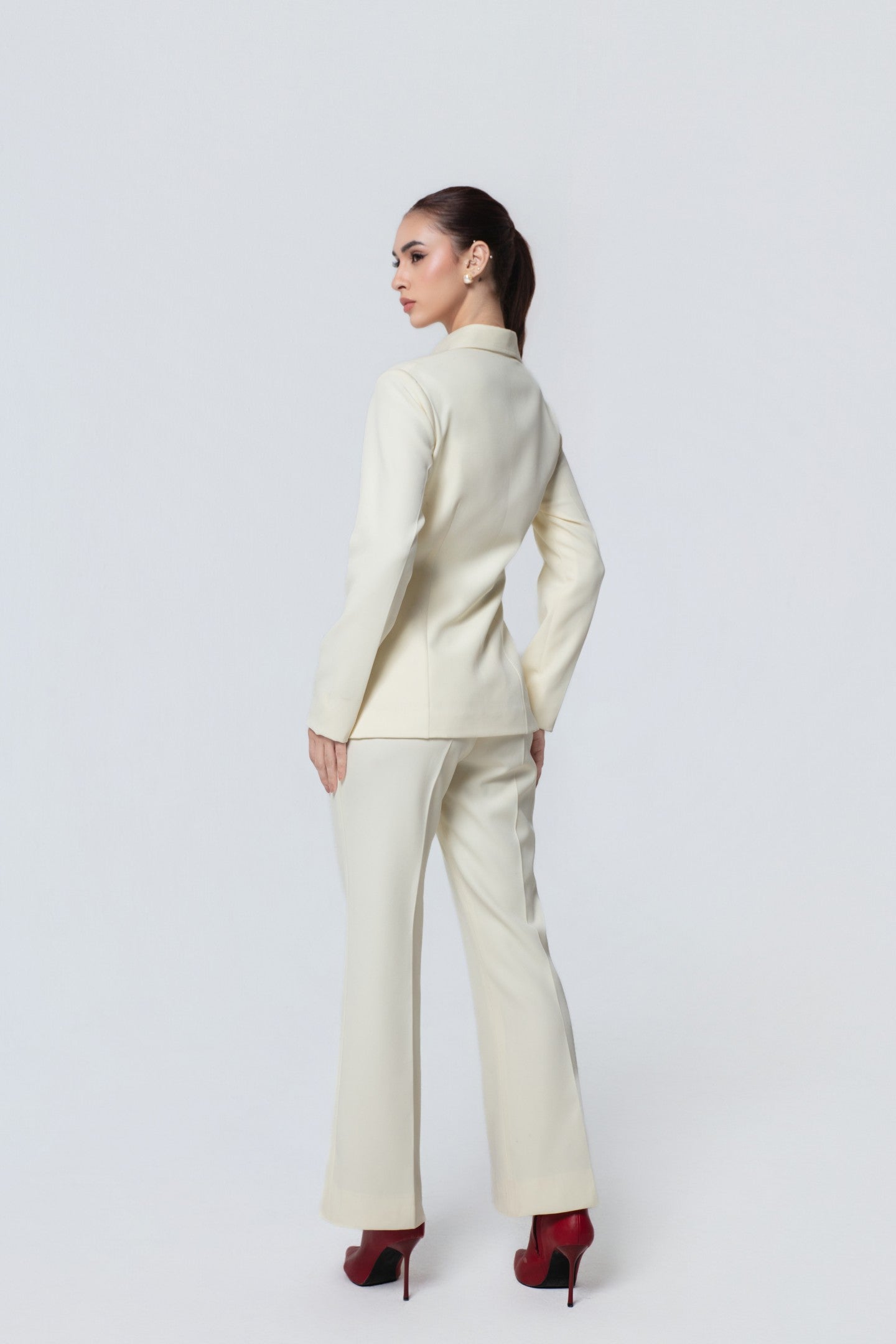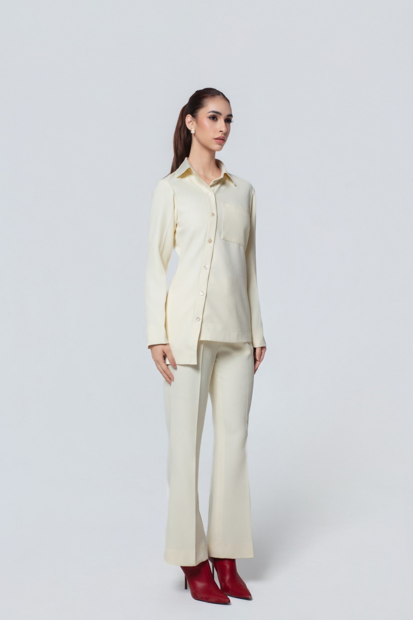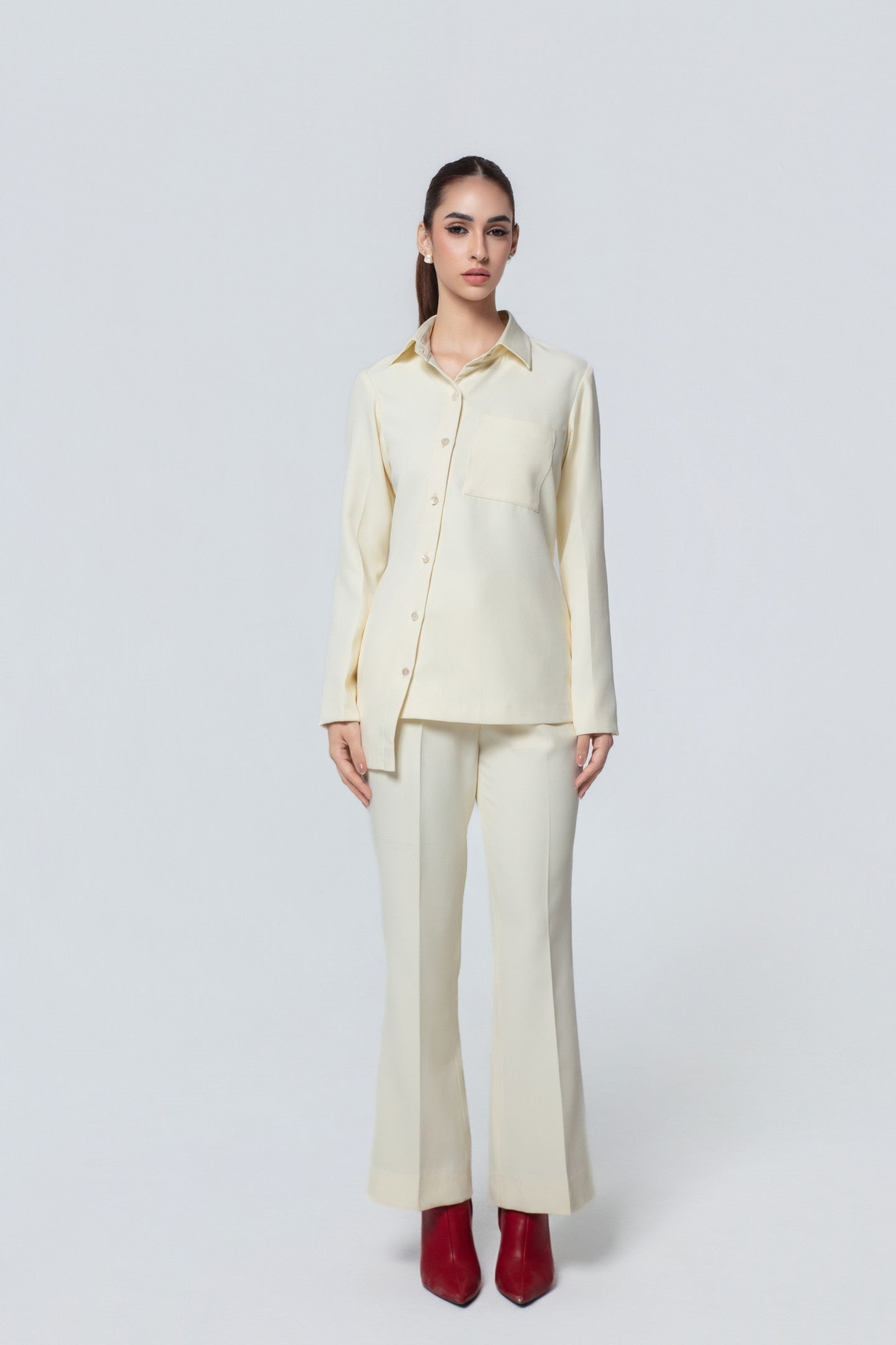 A tailored shirt and trouser set designed for elevated everyday wear. The shirt features a distinctive diagonal button placket, adding a modern twist to a classic silhouette.