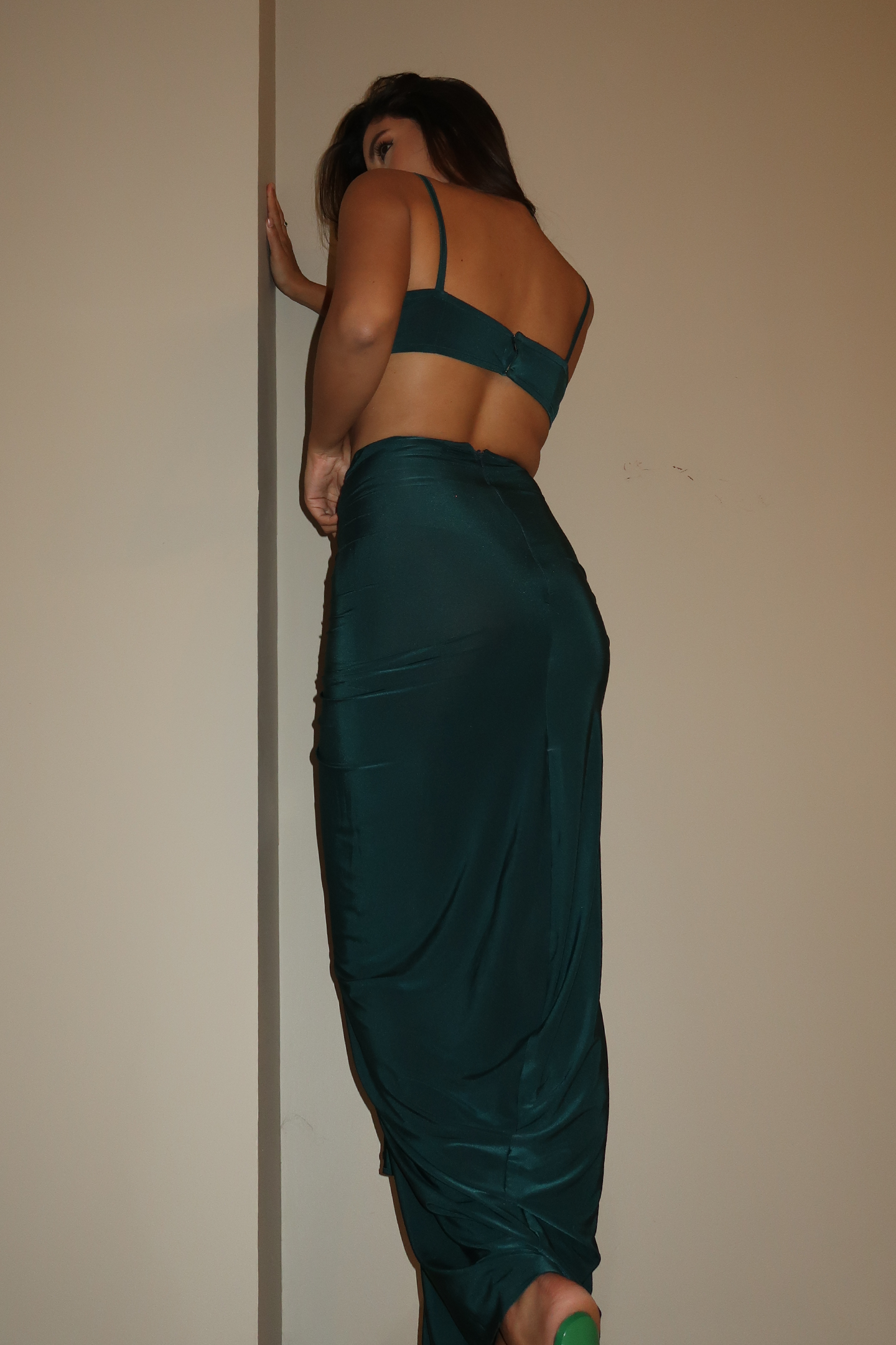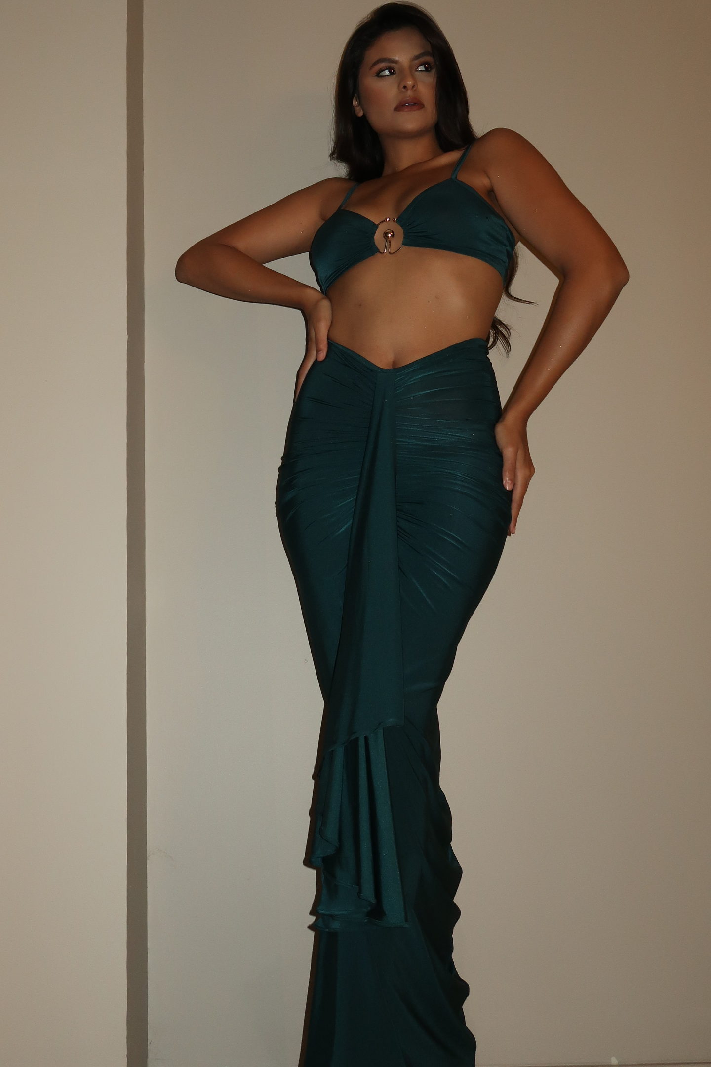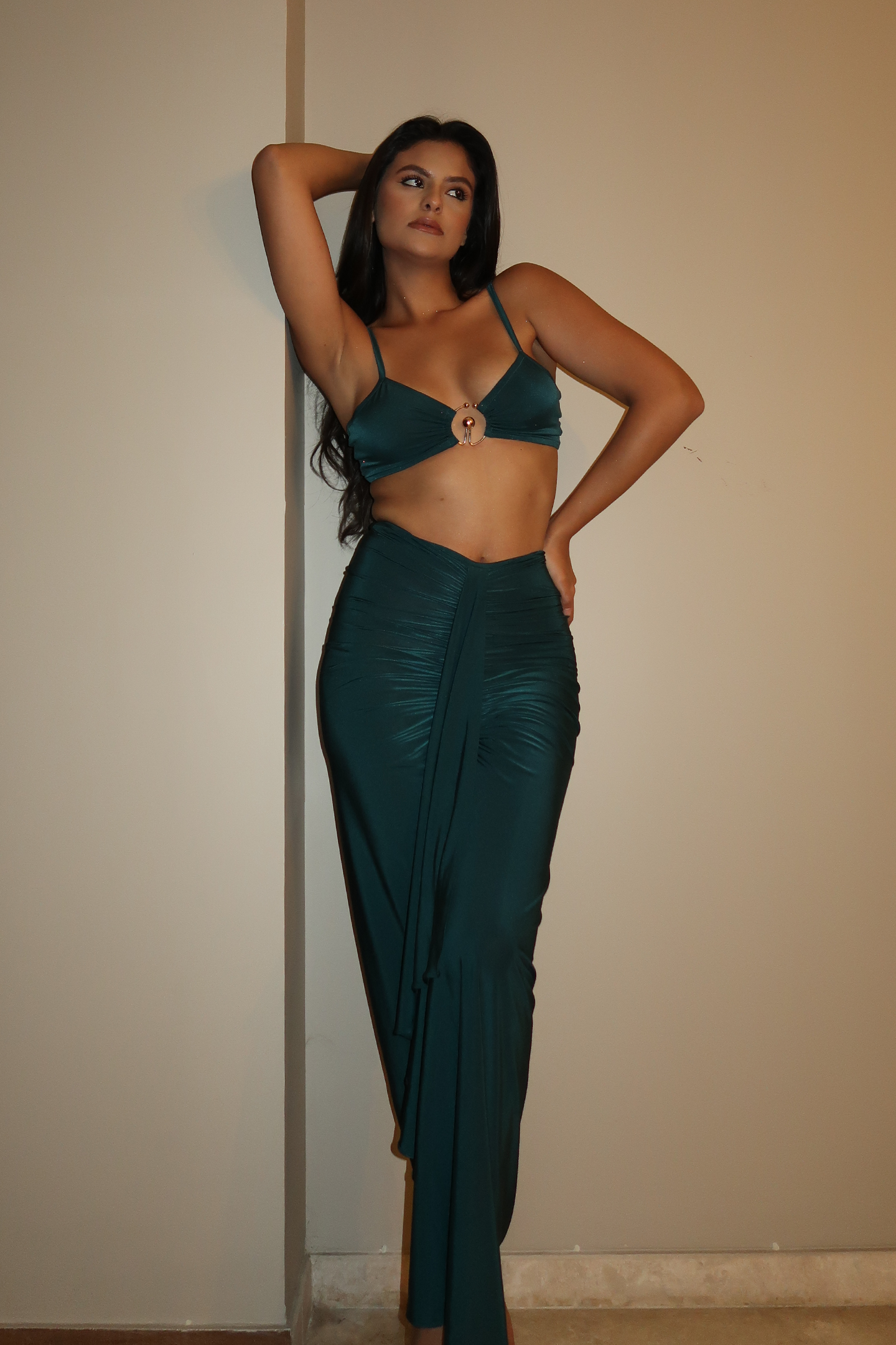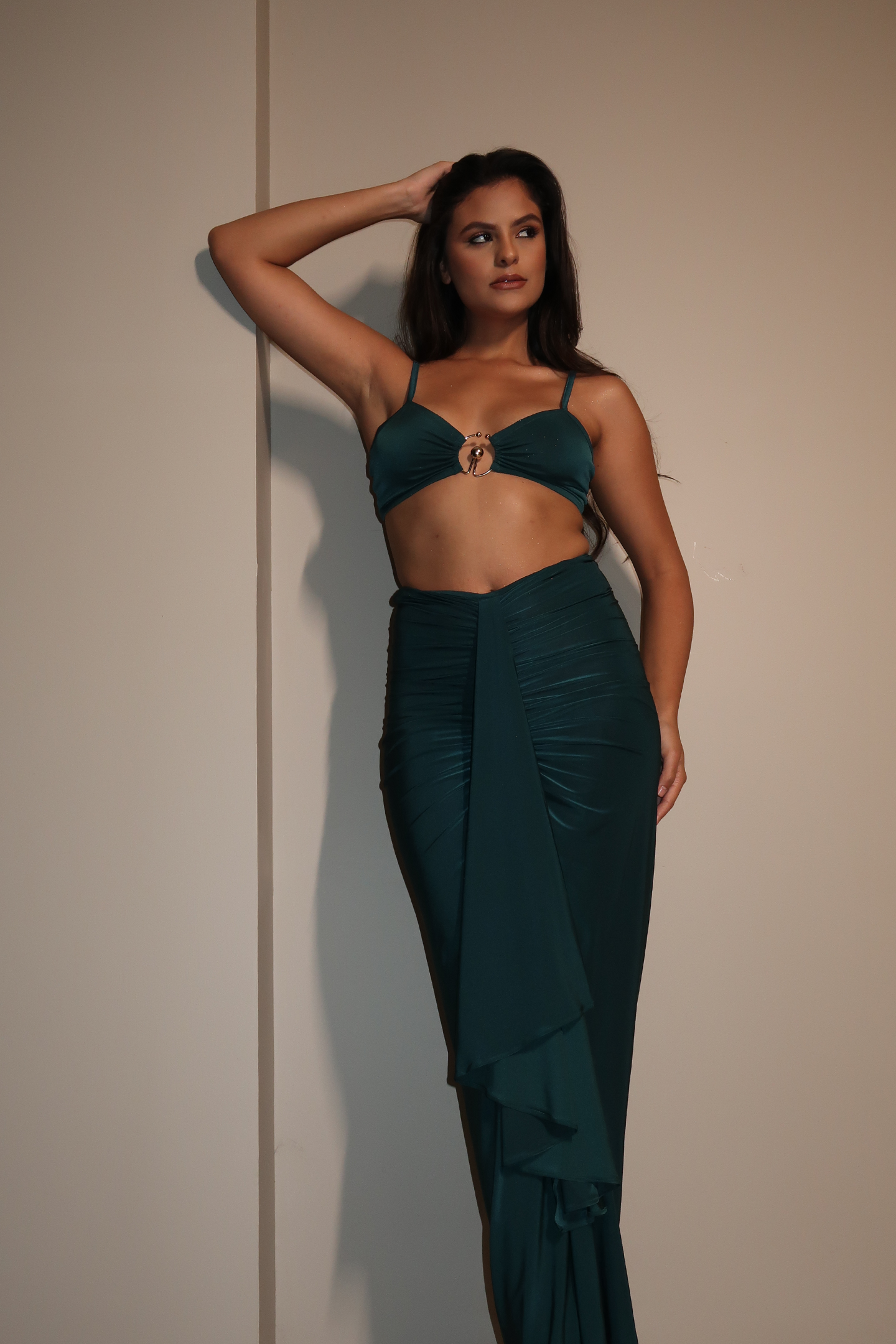 A fluid two-piece set featuring a ruched bralette with a metal-ring accent and a draped high-waisted skirt that falls into cascading layers. Designed to contour the body while maintaining soft movement, this look transitions effortlessly from resort evenings to modern soirées.
