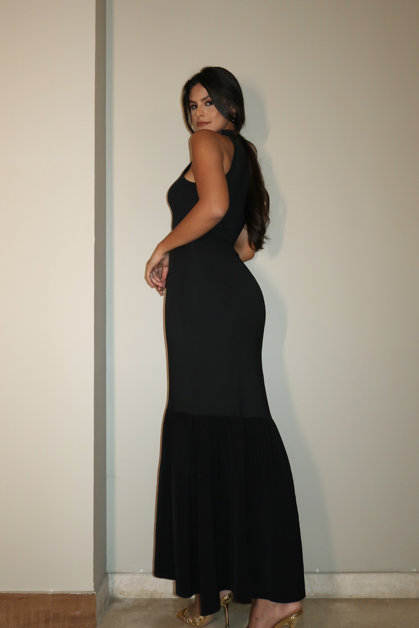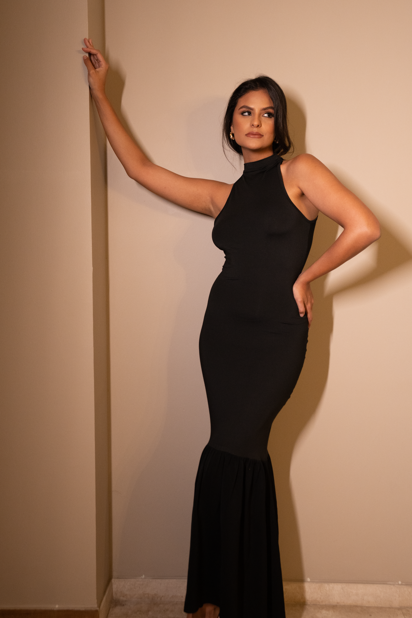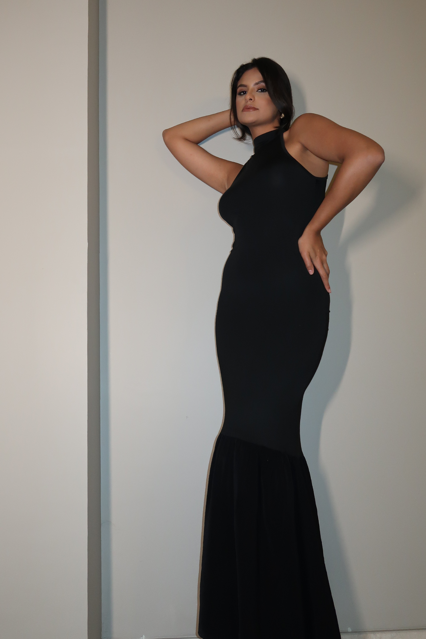 A sleek full-length gown featuring a modern asymmetric neckline and sculpted fit that accentuates the body. The structured crepe fabric offers both polish and movement — an elegant choice for refined evenings or contemporary black-tie moments.