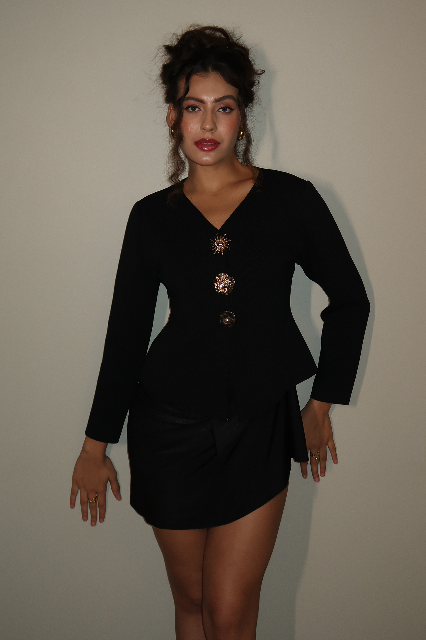 A refined knit top featuring ornate statement buttons that bring a hint of glamour to its clean, tailored shape. Designed in a soft wool-blend for comfort and structure, this piece effortlessly transitions from polished daywear to evening sophistication.